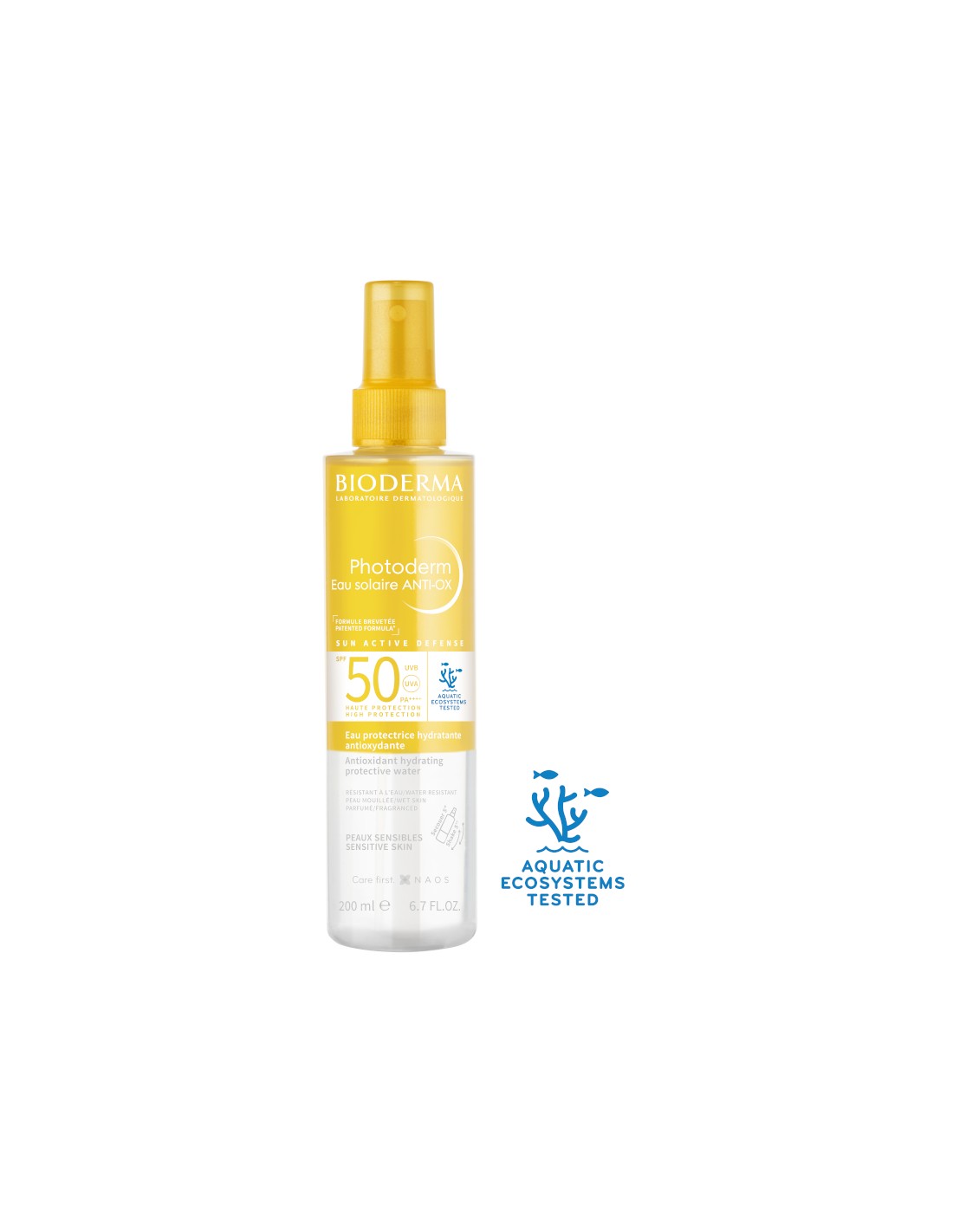 Bioderma Photoderm Eau Solaire Antiox SPF50 hidrata la piel y ofrece una alta protección solar frente a los rayos UVA/UVB. Este agua solar contiene antioxidantes que previenen el daño celular y el envejecimiento prematuro de la piel.